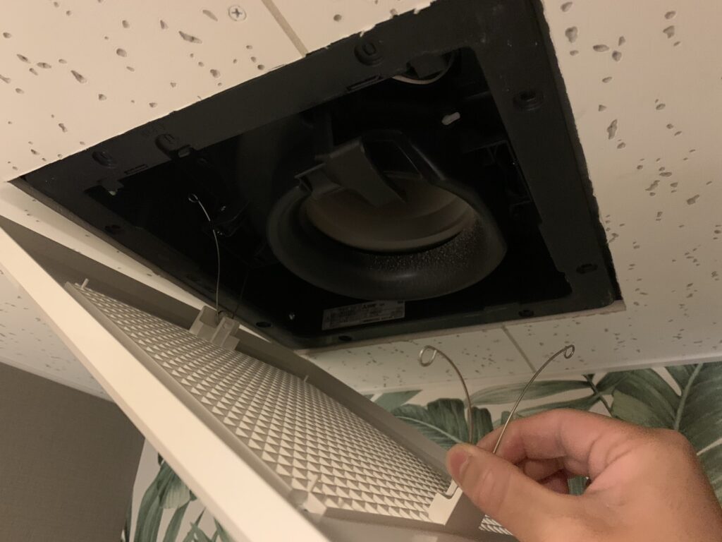 換気扇清掃方法 マシンメンテナンス 2025.10.042025.10.05 1:換気扇のスイッチを止める2:本体カバーを引き下げてワイヤー部を内側につまみながら下に下げると本体カバーが外れる 本体カバー ワイヤーを内側につまみながら外す 3: